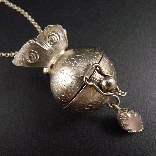 Stříbrná koulička zdobená ručně lisovaným vzorem květinek ukrývá uvnitř malý poklad - motýlí studánku, v podobě broušeného nebesky modrého topasu..na kouličce se usadil motýl paví očko, strážce vzácného pokladu..pod kouličkou je zavěšená kapka růžového chalcedonu..