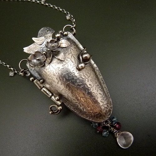 Kouzelný otevírací medilonek s květinkovým vzorem a krásným jemně tepaným ptáčkem v květinkovém hnízdečku je nádhernou a originální ozdobou něžné ženské duše..