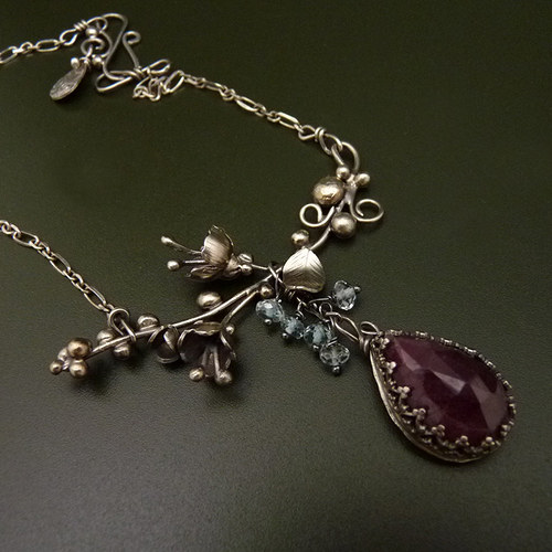 Krásná větvička obrostlá zvonečky- zvoníčky, lístečky a poupaty- stylizovanými kuličkami v hroznech je dozdobená nádherným, velkým broušeným rubínem a akvamarínky..