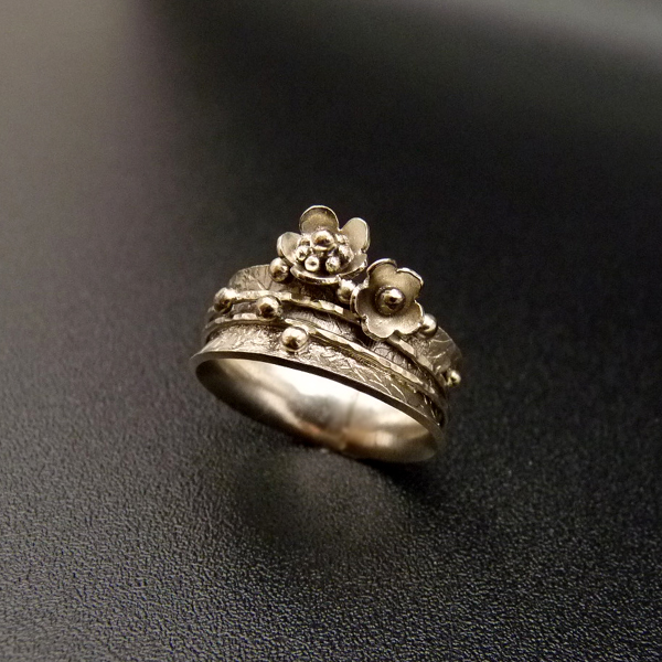 Unikátní prsten je zdoben něžnými květinkami, tepanými obroučkami uprostřed a lisovaným vzorem květinek..
