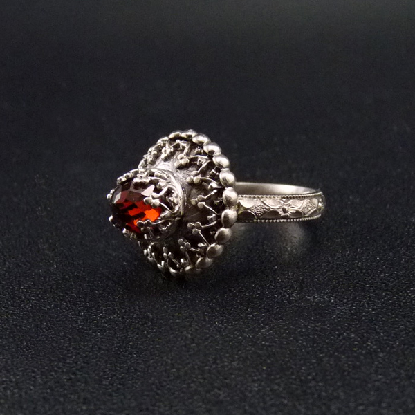Nádherný, velmi propracovaný prstýnek s jiskřivým granátem jako třešničkou na koláčku je dozdoben mnoha něžnými ornamentálními prvky a usazen na obroučce Art deco..