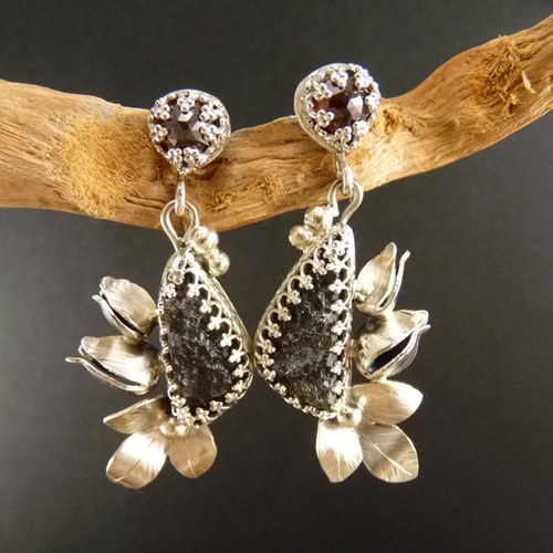 Rozkošná tepaná poupata starých francouzských růží něžně doplňují vsazené vltavíny, které jsou dozdobené růžovými listy a granáty božsky odleskujícími do červena..