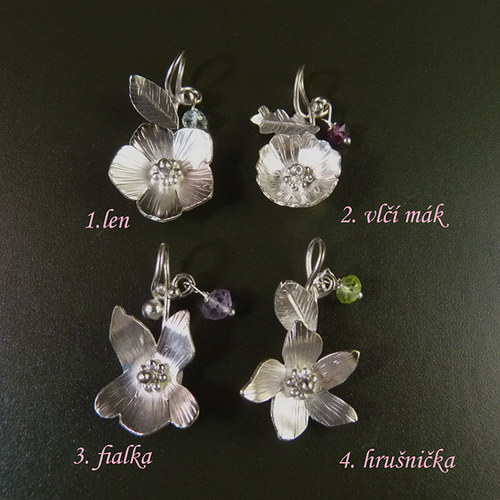 Něžné květy jsou tepané, stejně jako jejich lístečky, které jsou ještě zdobené gravírováním. Na ozdobném stonečku je zavěšena vždy jedna rondelka polobrahokamu.