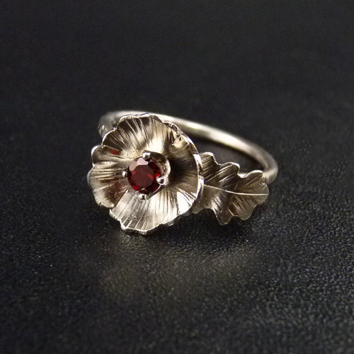 Rozkošný tepaný květ vlčího máku je umístěn na tepané obroučce a dozdoben vsazeným broušeným granátem uvnitř květu a listem..